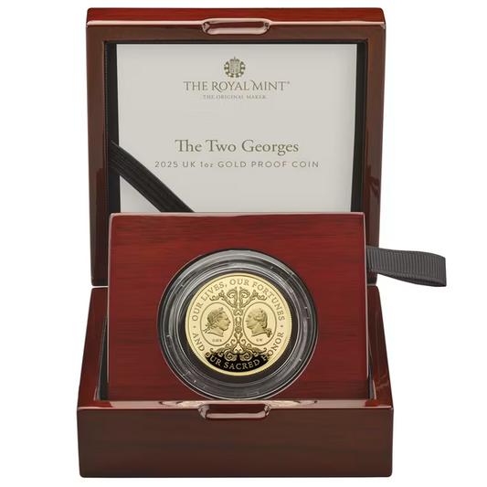 Celebrate a moment where history and artistry meet with The Two Georges 2025 1oz Gold Proof Coin from The Royal Mint. Beautifully struck in one ounce of fine .9999 gold, this exceptional release unites the profiles of King George III and George Washington — two iconic figures forever linked by the American Revolution.